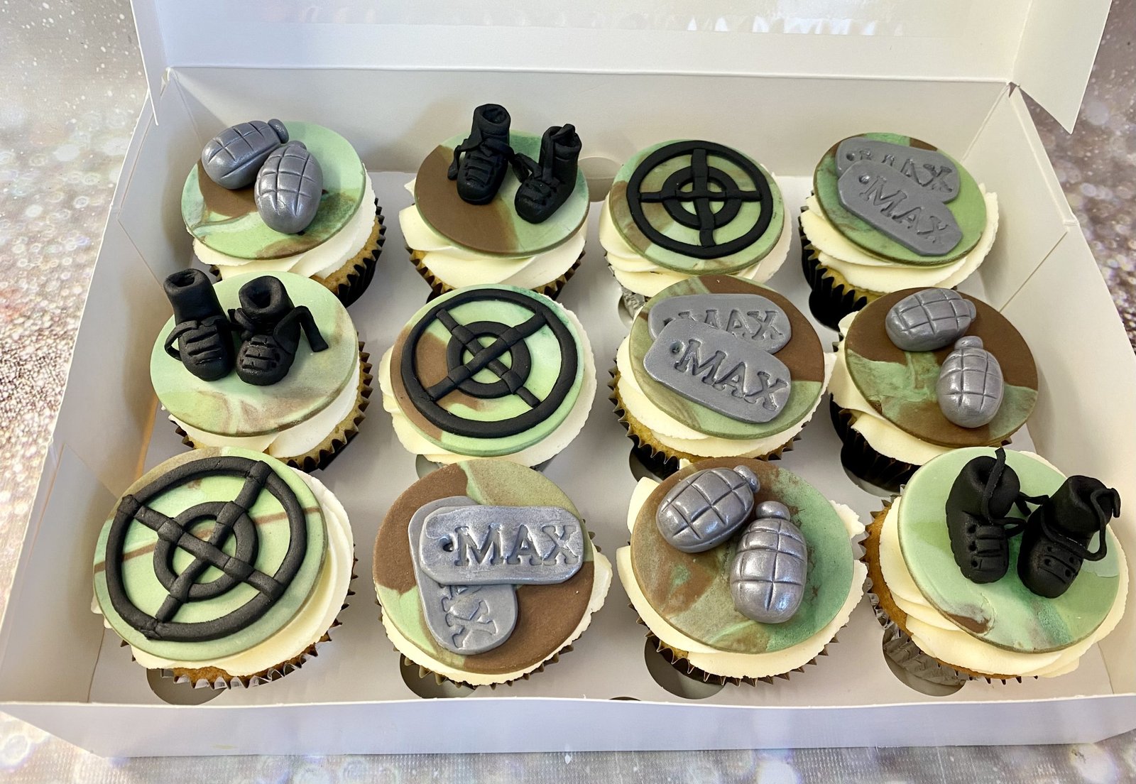 A box of 12 delicious cupcakes with motifs including targets/crosshairs, dogtags, grenades, and boots, in the flavour of your choice. Please specify name in checkout notes, or will be left blank.