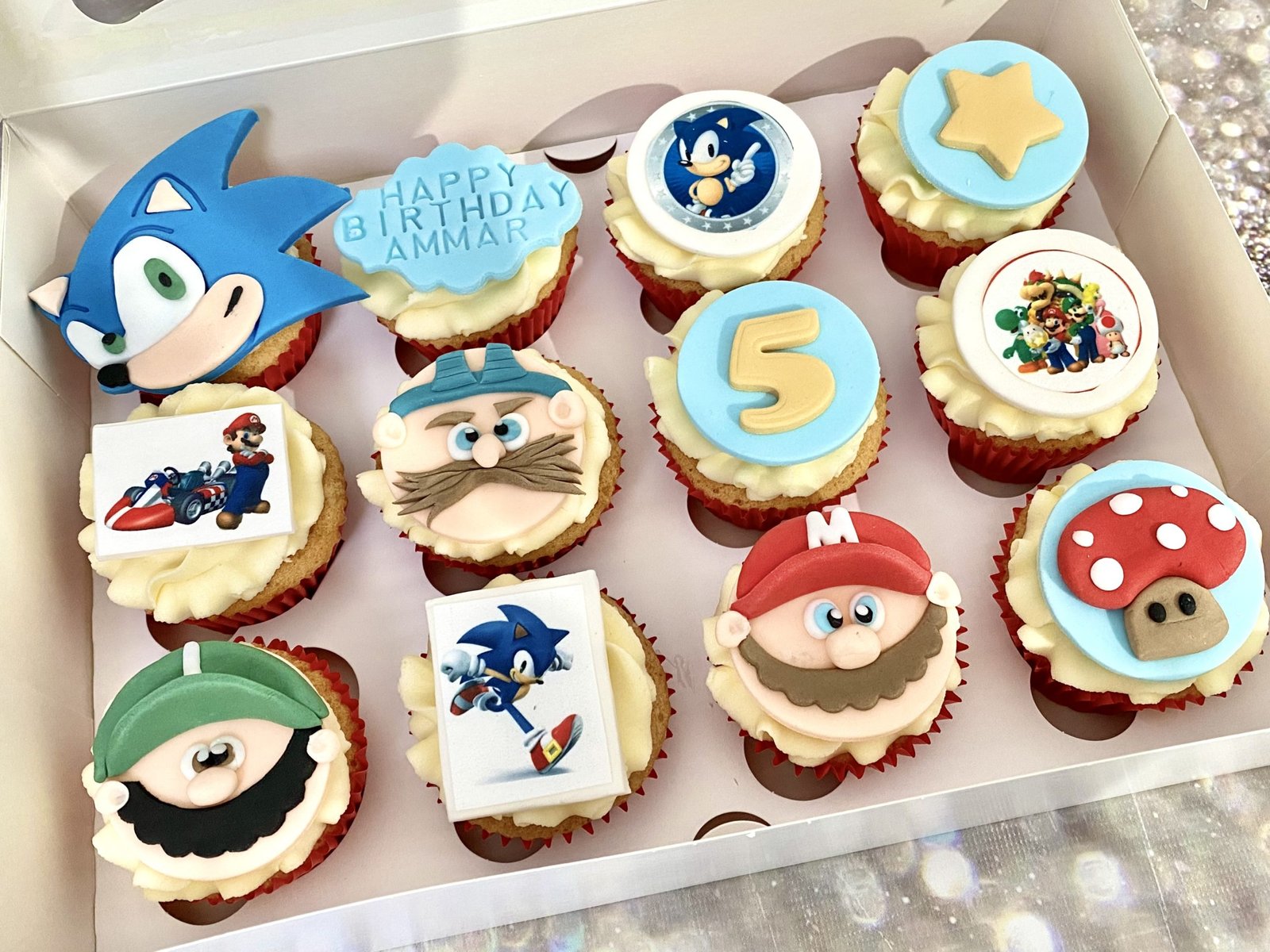 A box of 12 delicious cupcakes with cartoon character motifs and ‘Happy Birthday’ plaques, in the flavour of your choice. Please specify age and theme at checkout.