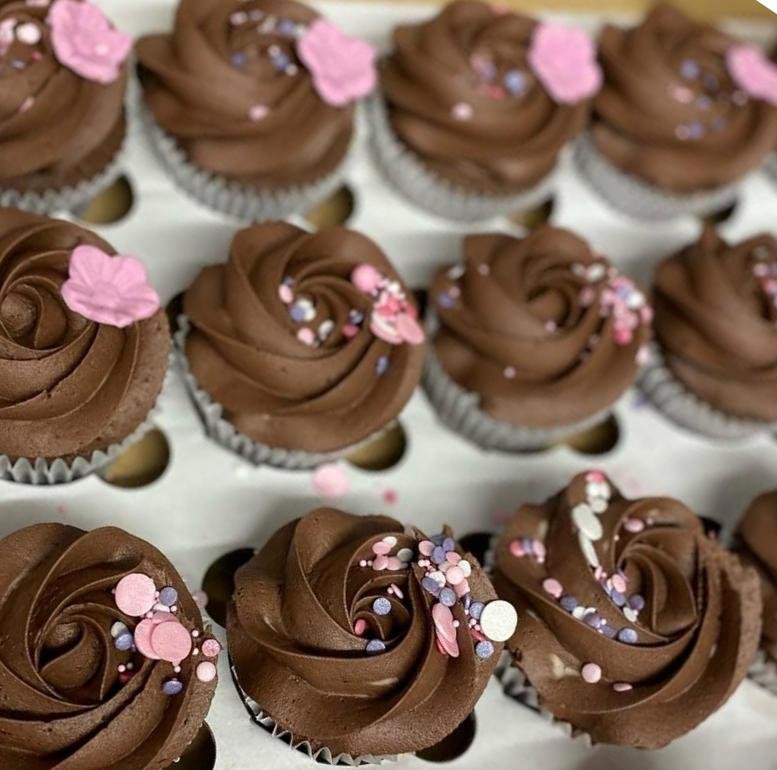 A box of 12 delicious chocolate cupcakes decorated with cute flowers and sprinkles, in the colour of your choice. Please use order notes at checkout if you’d like a specific colour combination.