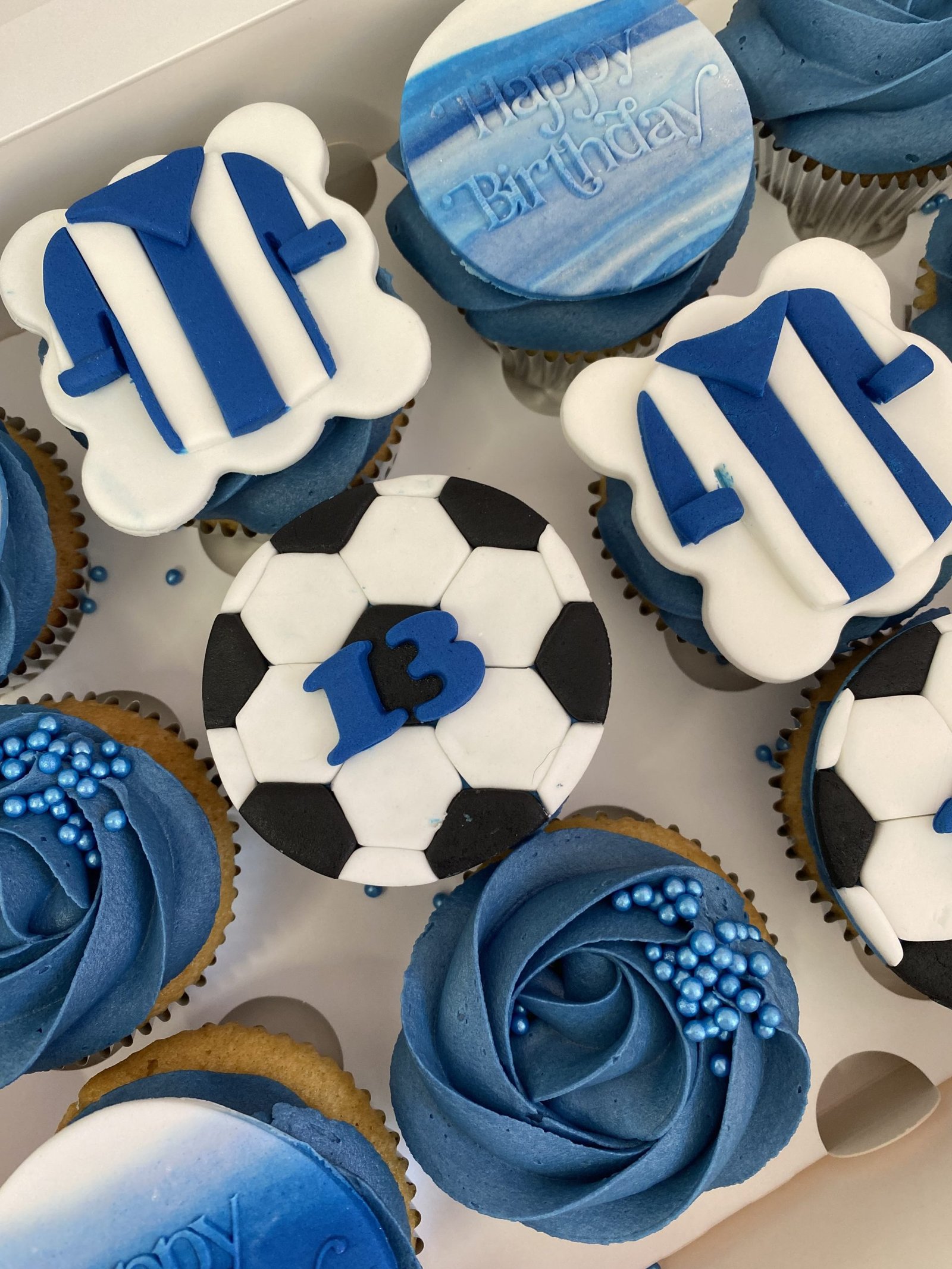 A box of 12 delicious cupcakes with football motifs and ‘Happy Birthday’ plaque, in the flavour of your choice. Please specify team/colours/age in the notes at checkout.