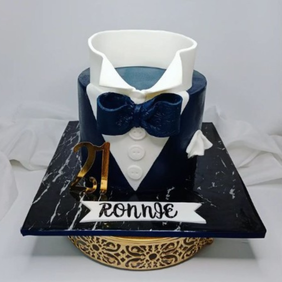 A delicious, light, and fluffy buttercream celebration cake using our signature special recipe fatless (unless vegan/eggless/dairy-free!) vanilla/chocolate sponge and your choice of 19 different filling flavours. Suit/Bow Tie in the colour of your choice.