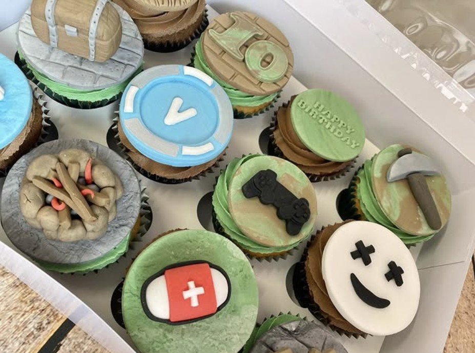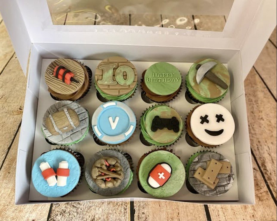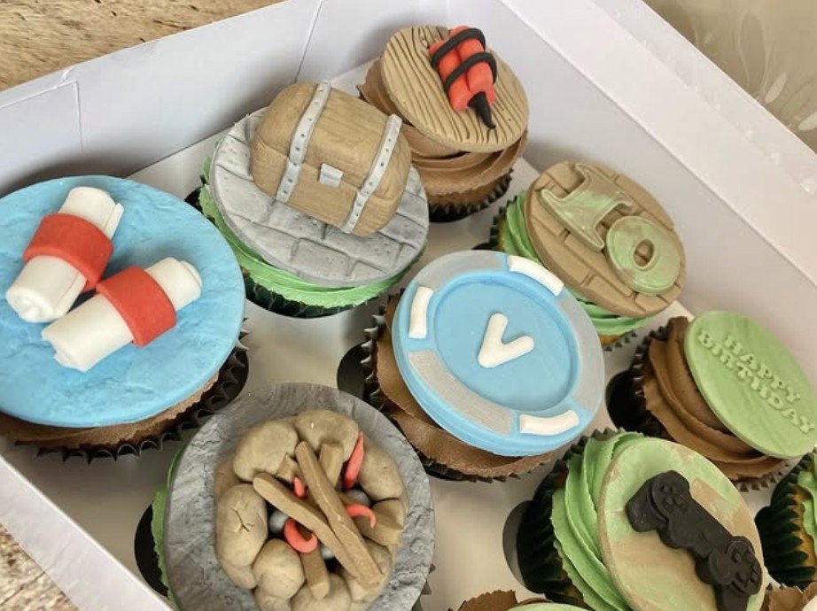 A box of 12 delicious cupcakes with gamer motifs, age, and ‘Happy Birthday’, in the flavour of your choice. These were inspired by ‘Fortnight’, but tell us the game you’d like at checkout and we’ll bring the theme to life in cupcake form!